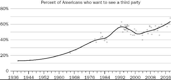 When there are only two options, voters do not have very much power. They do not get to express themselves except by a directional preference along one axis, and the axis is determined by the bilateral maneuvering of just two agents (i.e., the two parties). Most countries have different election laws which allow multiple parties to be represented in the legislature (“Proportional Representation”). This is a much better system, and we should modify our laws to allow for this.