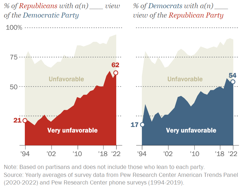 How is this possible? Because even as they come to dislike their own party, they have come to dislike their opponents even more!